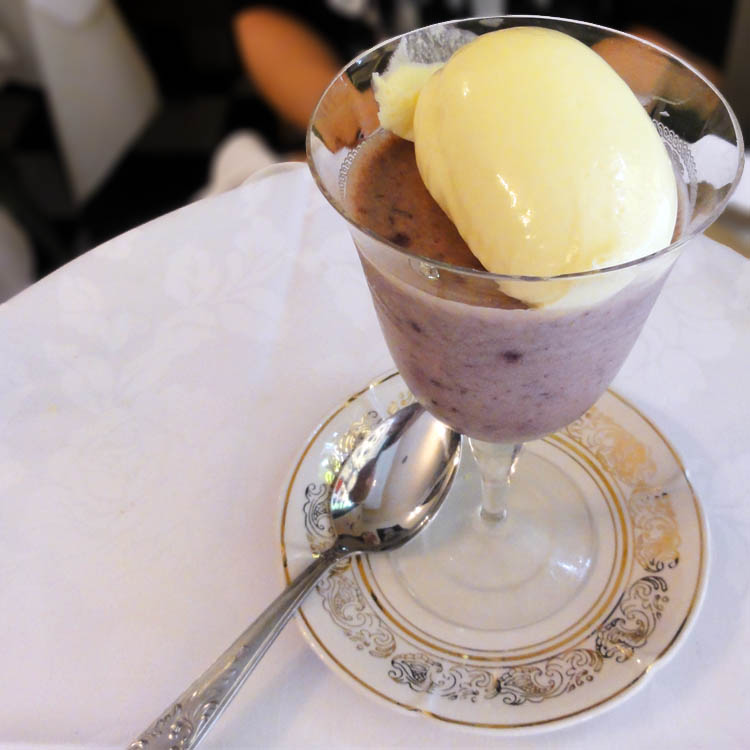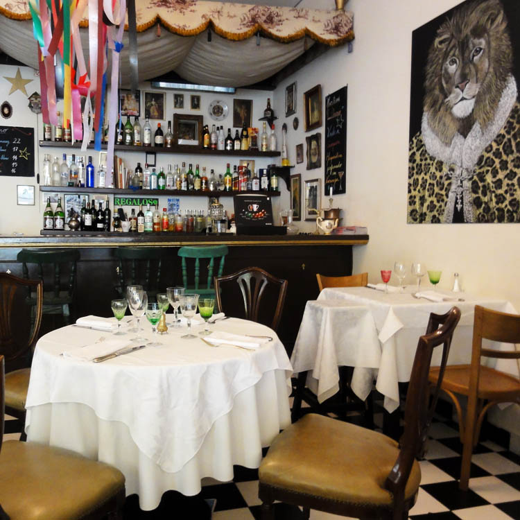 El lugar es encantador y me recordó bastante a los bistrós parisinos que tuvimos la oportunidad de conocer durante nuestro viaje: muy cálido y con un aire entre rococó y kitsch, desde la decoración de las paredes (unos pizarrones con dibujos en tiza que cambian por temporadas) hasta la vajilla antigua y toda diferente entre sí.