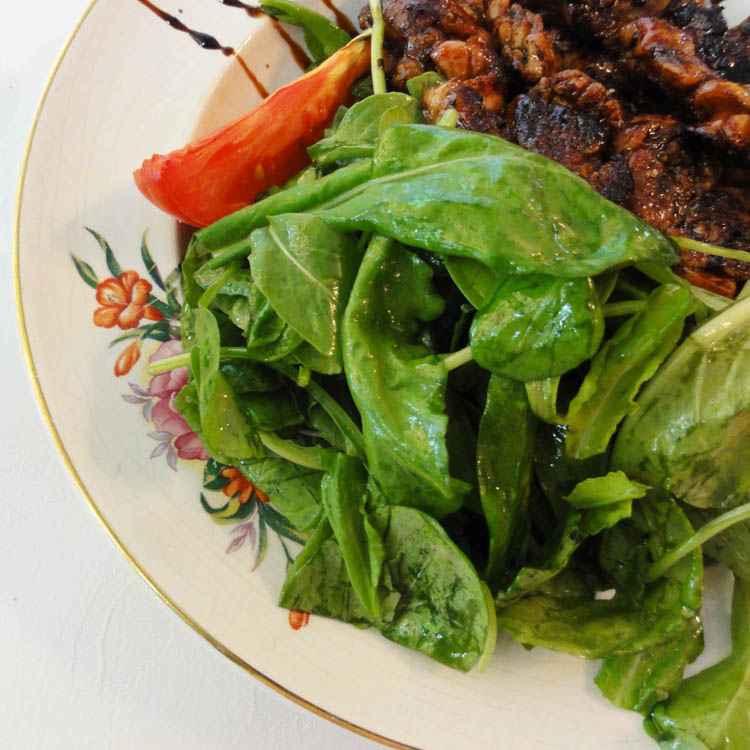 Para empezar, compartimos una Ensalada de mollejas crocantes, rúcula y tomates asados, con reducción de soja y miel de caña que estuvo mil puntos, y que acompañamos con un Santa Julia Syrah Rosé super fresquito.