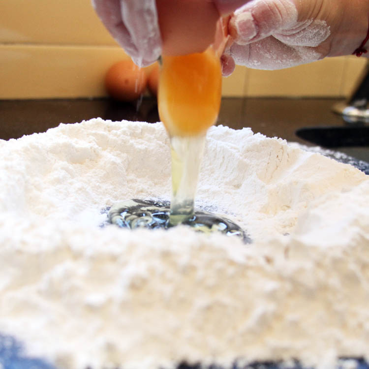 Colocamos la harina con un poco de sal en la mesada y armamos una especie de volcán para colocar en el centro los huevos y el aceite. Integramos todo poco a poco y amasamos hasta conseguir un bollo. Tapamos y dejar reposar durante media hora.