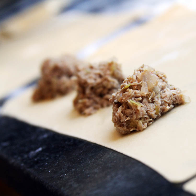 Cortamos en brunoise el puerro, la cebolla y el ajo y ponemos todo a sudar en una sartén con un poquito de aceite. Salpimentamos y agregamos un vaso de vino blanco seco para desglasar. Finalmente incorporamos la carne cortada en cubos, hierbas provenzales y pimentón a gusto, y dejamos al fuego hasta que la carne esté cocida. Pasamos todo a un bowl y procesamos, cuidando que el relleno quede con cierta textura (NO tipo puré).