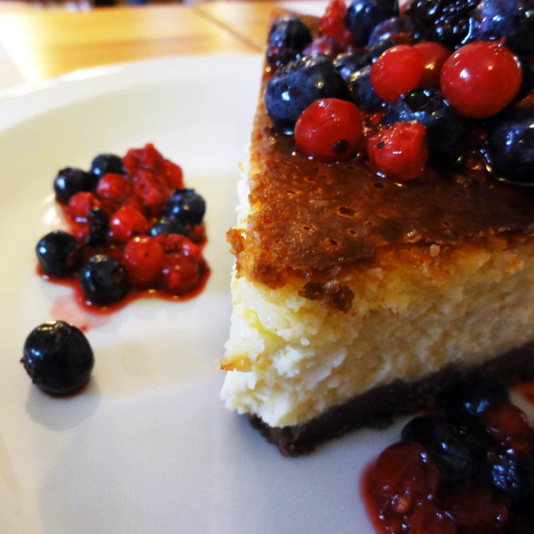 Para terminar –y aún sabiendo que ya no podíamos ingerir ni un solo bocado más– nos animamos con la Cheescake con salsa de frutos rojos ($22)… Y gracias a Dios que así fue porque estaba para comerse la tarta entera!!! Riquísima señores.