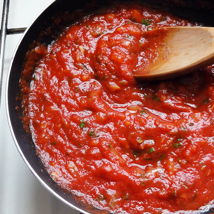 - Calentamos el aceite en una sartén y salteamos la cebolla y el ajo a fuego lento, hasta que estén tiernos. Incorporamos el tomate, la albahaca, el perejil, el azúcar y salpimentamos. Cocinamos la salsa entre 10 y 15 minutos, hasta que espese.