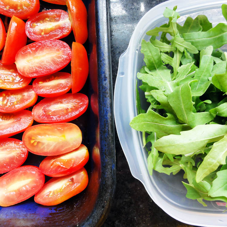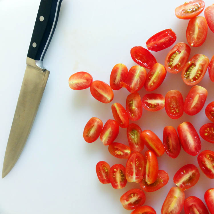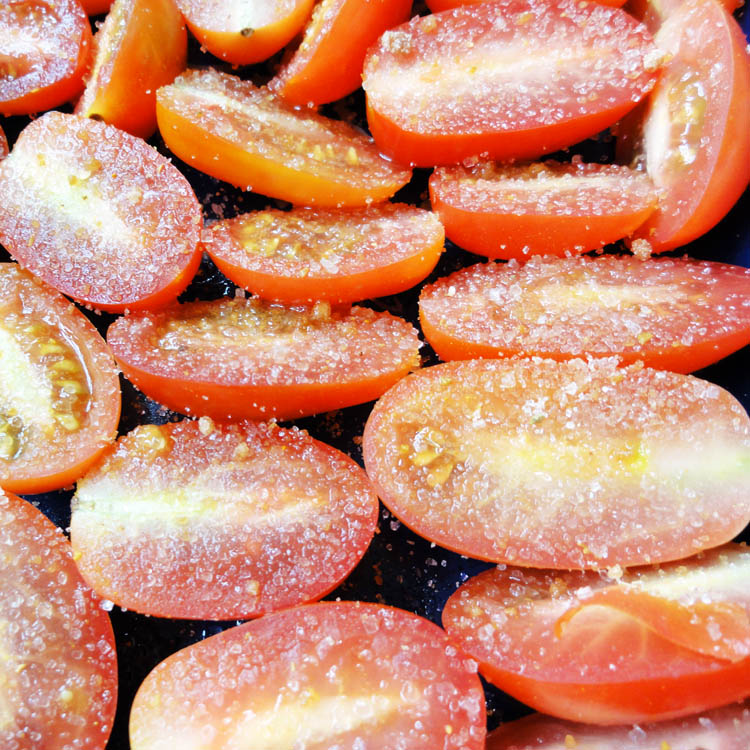 Cortamos los tomates cherry al medio y los colocamos en otra placa previamente aceitada. Los rociamos con sal, pimienta, azúcar y aceite de oliva, y llevamos al horno junto con las calabazas por unos aproximados 30 minutos (igual recomendamos ir chequeando cada tanto).