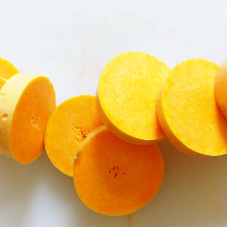 Mientras tanto, cortamos la calabaza en rodajas y condimentamos con sal, pimienta, azúcar y una pizca de comino (opcional). Las ubicamos en la placa caliente con un cubito de manteca por encima y llevamos a horno medio hasta que esten doradas y blanditas.