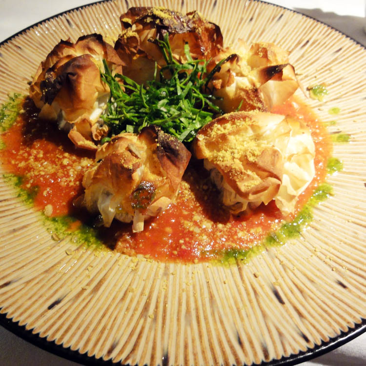 Pero la noche seguía en ascenso, y llegaba el turno de Frank para acompañar nuestros principales: Ale se pidió la Hamburguesa de Hongos, con puré de calabaza, ensalada criolla y crema de mostaza ($52). Por mi parte, me vi tentada por un Risotto de Mango que no estaba disponible (juro que volveré por tí…), así que la señorita que nos atendía me recomendó sin atisbo de duda la Pasta Crocante: ricota de almendras y espinacas, envueltas en crocante masa filo, con salsa pomodoro ($52).