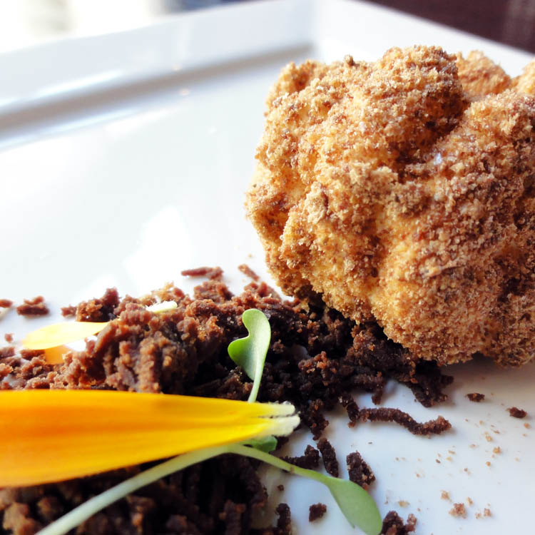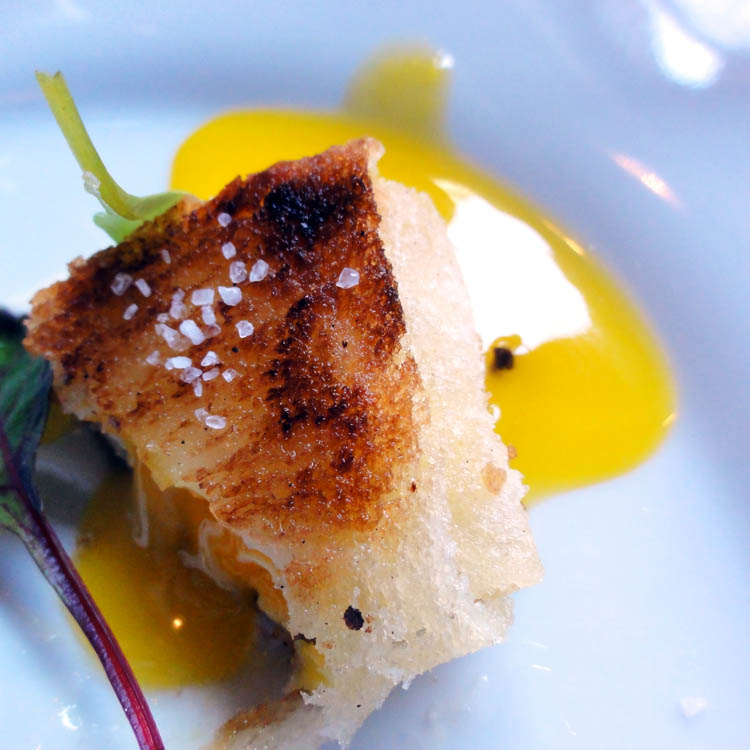 Yema envuelta en pan + reducción de alitas de pollo & aceite de trufa blanca en polvo.