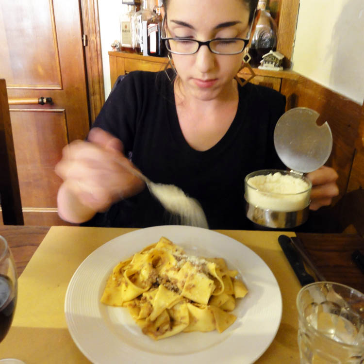 ¿Qué pedimos? Yo elegí unos Pappardelle al sugo d’anatra (unas cintas de pasta bien anchas cubiertas con carne de pato que estaban INCREÍBLES!) y Ale se decidió por una porción del mejor Vitel Tonné que probó en su vida. La perlita: la elección de Ale le valió una felicitación del mozo, ya que el Vitel Tonné suele ser un plato pedido exclusivamente por los locales. Para tomar, pedimos una copa de vino tinto y 2 aguas (con y sin gas).