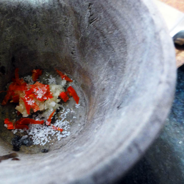 En un mortero, aplastamos el diente de ajo con un poco de la sal marina. Agregamos también los trozos de chilecito y continuamos aplastando (no al punto de formar una pasta). Añadimos luego el cilantro picado y seguimos aplastando todo. Finalmente, agregamos aceite de oliva (1/4 taza) para integrar todo y volverlo un lindo aderezo para nuestra ensalada.