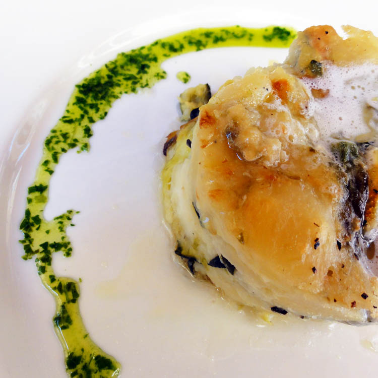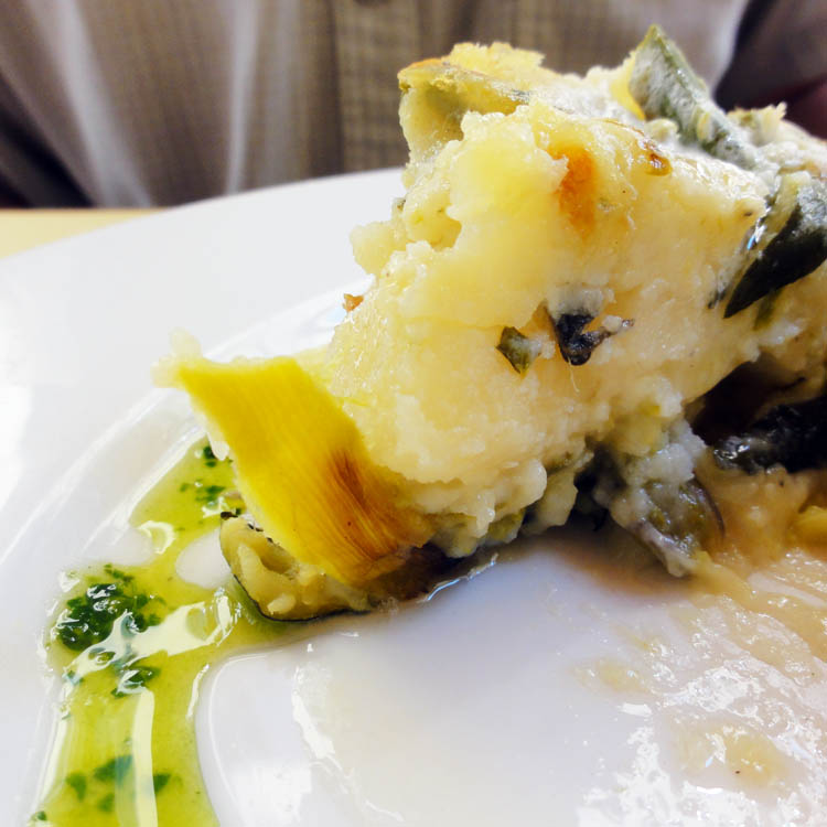 Tortino di patate, asparagi, zucchine e pecorino dolce (papas gratinadas, espárragos, zucchini y queso pecorino dolce), por €7.