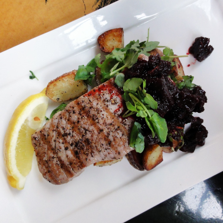 El principal compartido fue un Tonno (filete de atún a la plancha con salsa de remolachas, menta y papas). El atún estaba muy rico y picosito y las papas con mantequita estaban deliciosas!