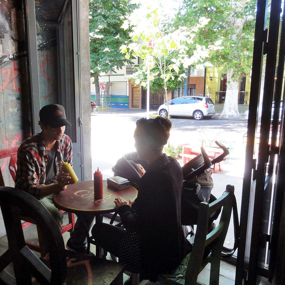 Llegar temprano (12.45) fue lo mejor que pudimos haber hecho. El lugar estaba aún vacío, por lo que pudimos elegir el espacio que más se adecuara a nuestras necesidades: una mesita adentro pero con salida a la vereda, que nos permitió acomodar el cochecito sin problemas.