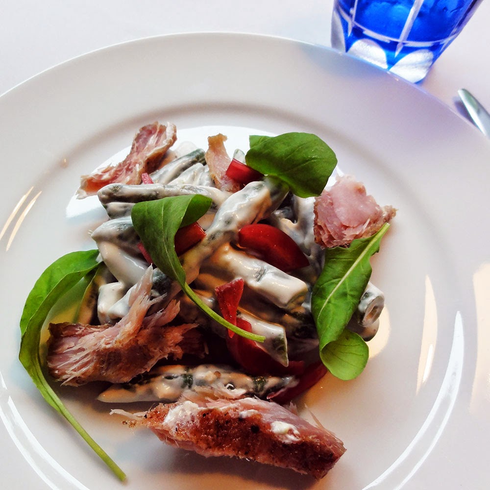 • Ensalada fresca de pescado ahumado, chauchas y echalotes. Livianísima y con un suave dejo a playa y mar.