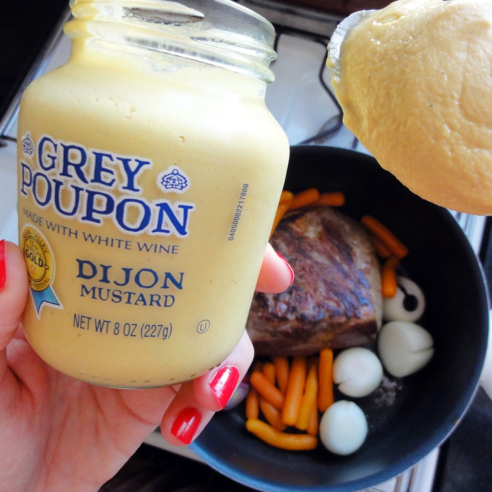 Una vez que la carne está dorada, agregamos a la olla las cebollas, las zanahorias, el tomillo y las batatas en almíbar. Untamos la carne con dos cucharadas abundantes de mostaza de dijón, la salsa de soja cremosa, un buen chorro del almíbar de las batatas y una cucharadita de humo líquido.