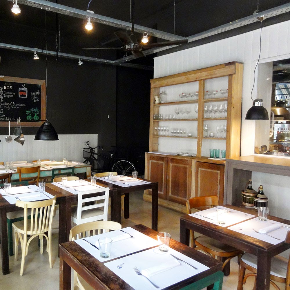 Ubicado justo en la esquina de Humberto 1º y Salta -tan sólo a media cuadra del que ya conocíamos- este nuevo emprendimiento de Gonzalo Aramburu sí que sabe como llamar la atención de los transeúntes con su fachada verde inglés, un esqueleto de pescado dibujado en tiza sobre una pizarra enmarcada en madera y sus amplias vidrieras exhibiendo aceites de oliva, buenos vinos y productos gourmet de toda clase. A diferencia del ambiente tan sobrio del restó, el BIS apuesta de lleno a la luz natural y a la mesa de madera gastada, con un aire casual y rusticón (aunque bien cuidado) que lo vuelve todavía más amigo de la gente.