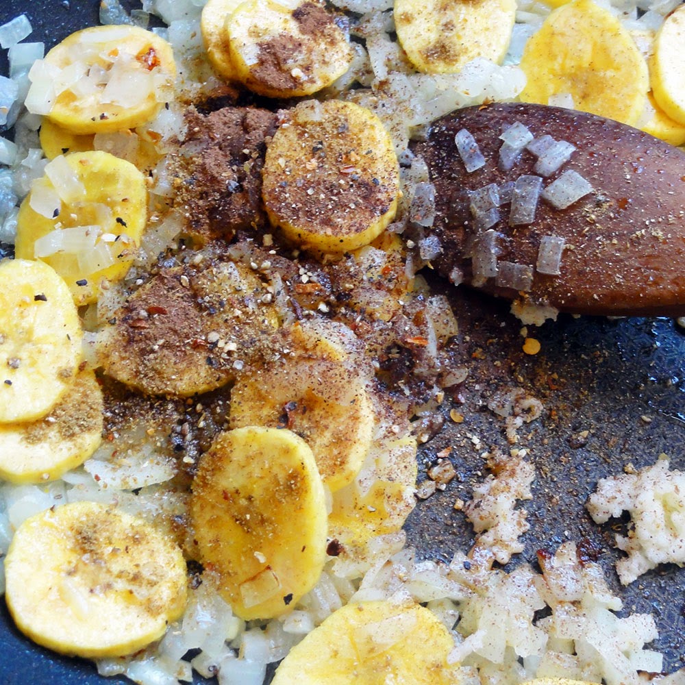 Calentamos unas cucharadas de aceite de oliva en una sartén sobre fuego medio, salteamos el plátano en rodajas y la cebolla picada finita, hasta que transparente. Agregamos el ajo picado, el chile en polvo, el comino y la canela, y dejamos unos minutos más hasta que las especias se tuesten y los sabores se integren. Incorporamos los tomates ya pelados y en cubos, el morrón en cubitos, los chilecitos picados bien chiquitos, el caldo, el chocolate picado y la mantequilla de maní y rehogamos todo durante 10 minutos. Colamos y procesamos hasta tener una salsa tersa y homogénea.