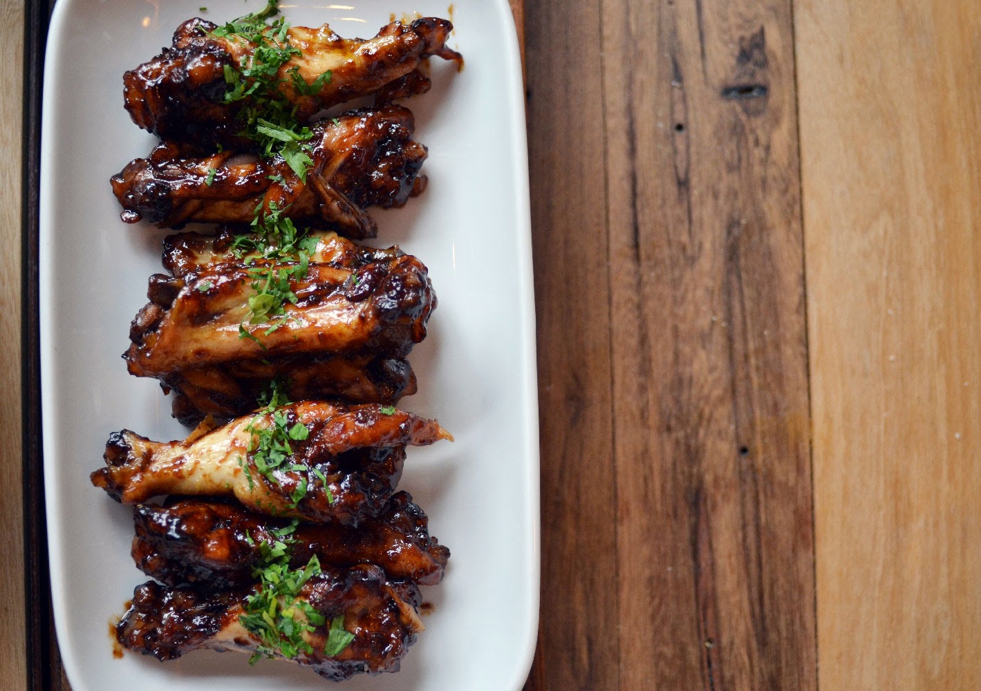 El padre de estas deliciosas alitas cubiertas con una salsa de la hostia es Paco, el jefe de cocina de la mañana, que al parecer se antojó con hacer este plato y tan bien le salió que Ed que no dudó ni un momento en incorporarlo al menú (gracias a DIOS). La salsita espesa, dulzona y divina que las recubría casi por completo tiene no menos de 24 ingredientes, entre ellos un poco de buen bourbon (obvio que Jack Daniel’s), salsa de soja, miel y jarabe de malta. El resto es un shhhhsecreto que muy sabiamente Ed y Paco guardan bajo siete llaves.