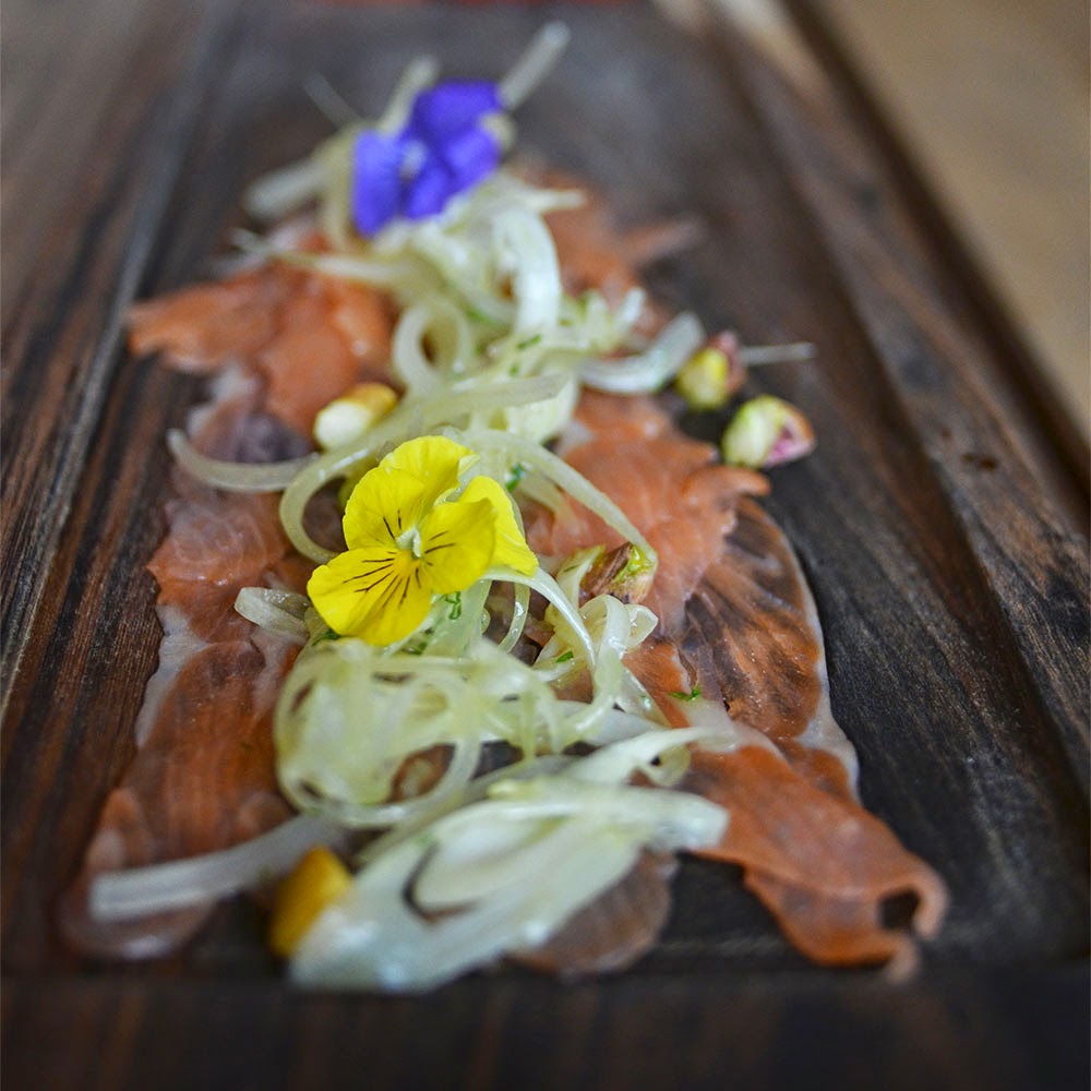 La ensaladita de hinojo y unos pistachos por aquí y por allá fueron los encargados de sumar textura al intenso sabor de la trucha ahumada, que llegó a la mesa sobre una tabla de madera rústica, presentada en finísimas lonchas. Buen comienzo!