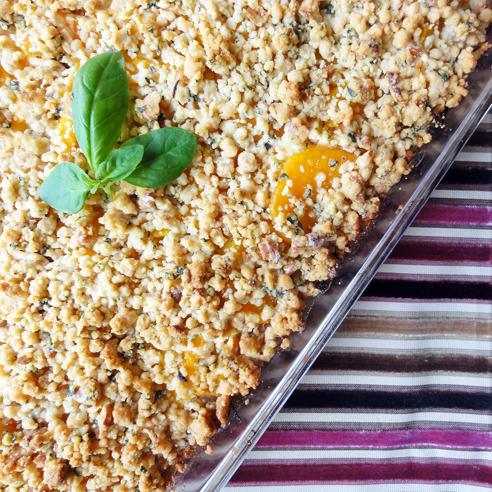 En el mientras tanto, enmantecamos una fuente para horno rectangular, y colocamos una capa de papas en la base, luego una de queso, una de calabaza, una de cebolla, otra más de calabaza y -por último- cubrimos con el crumble.
