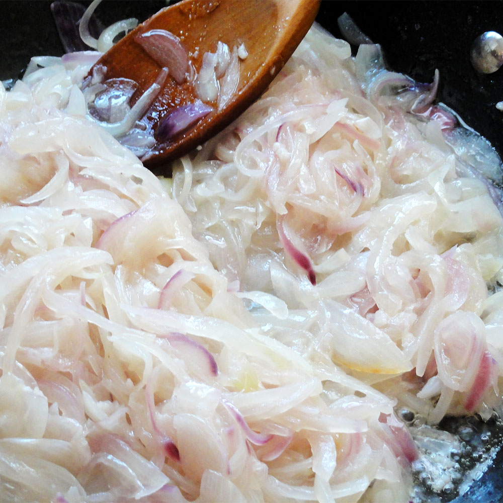 Pelamos la cebolla y el echalotte, los picamos bien chiquitos y los rehogamos en una sartén con un poco de aceite, hasta que transparenten.