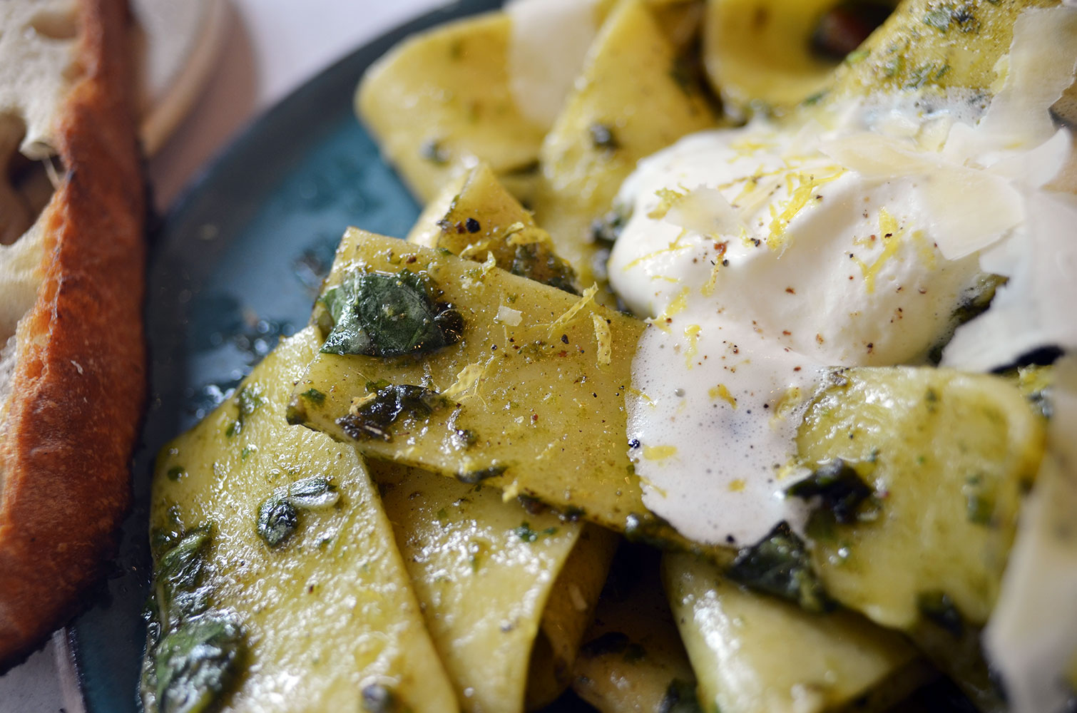 Párrafo aparte voy a dedicar a mis pastas, que fueron de lo mejor que me pasó en los últimos tiempos: unos Pappardelle caseros con pesto de albahaca, queso mascarpone casero, nueces de pecán y limón. POR DIOS mis pastas. Cada detalle de ese plato era perfecto. Lo primero que pude percibir fue esa fragancia cítrica que desprendía la ralladura de limón. Los sabores del pesto y de las escamas de parmesano no se quedaron atrás. El punto de cocción de los pappardelle era un al dente de podio. ¿Les dije alguna vez que las pastas acompañadas con algún crocante son mi debilidad? Se imaginarán entonces que las nueces de pecán fueron la frutilla de mi plato. El mascarpone casero cerraba con su suavidad este círculo perfecto. Estuve a punto de enterrar la cara bien en el centro de tanta cosa rica y quedarme ahí para siempre, pero Ale me llamó a la cordura. Todavía me arrepiento de haberlo escuchado. El bonus track fue una rodaja de pan de campo tostada con la que tuve el placer de limpiar el plato por completo.