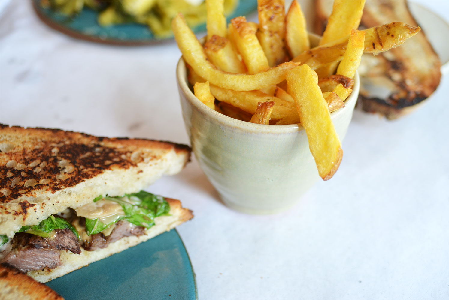 Por ser mediodía de un día de semana, pegamos la promo almuerzo (golazo): un prensatti + papas y bebida. Ale se pidió uno con Tagliatta de ternera, romero, aioli, rúcula y parmesano y recibió un generoso sandwich prensado a la chapa de hierro, relleno de carne jugosa y parmesano derretido, más un bowl de unas papas fritas que estaban excelentes. Todo estaba saliendo muy bien.
