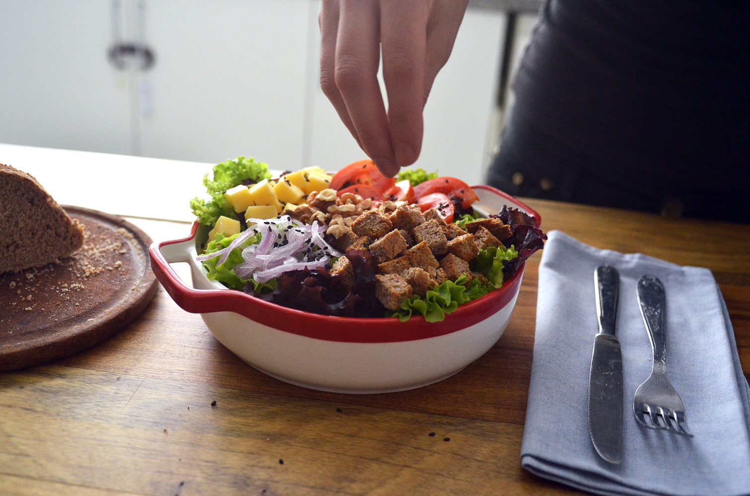 Para los croutones, se trajo su propio pan de salvado neutro, sin sal ni semillas. “Los panes los elaboramos nosotros, con un buen proceso de amasado y levado. Usamos harinas integrales, diferentes tipos de salvado y aceite de oliva. Algunas veces incorporamos semillas y otras no, dependiendo para qué lo usemos”. Corta un par de rodajas que transforma en cubos de igual tamaño. Los dispone en una fuente y los lleva al horno para que alcancen su punto justo de crocante. En el entretiempo, sigue con el resto.