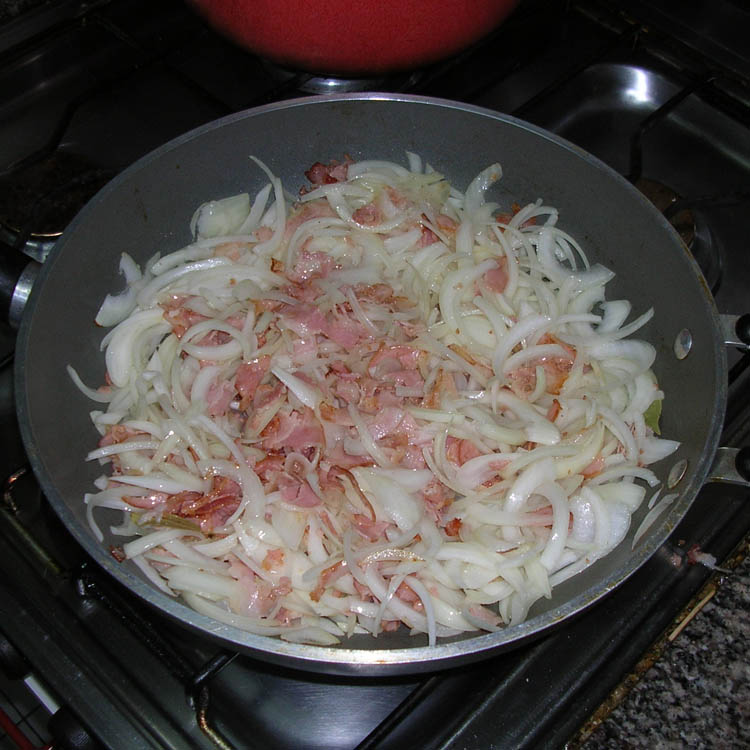Cortamos la panceta en lardons (en nuestro caso, tuvimos un pequeño error técnico en el super y compramos la panceta en fetas, asíque la tuvimos que cortar en trocitos).