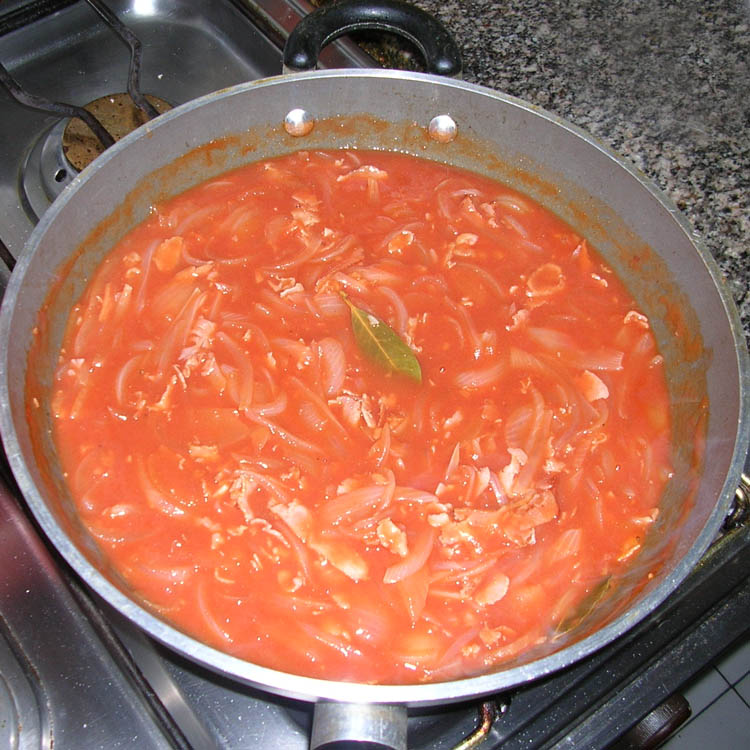 Fucciles con salsa de tomate, panceta, cebolla y vino blanco